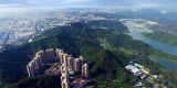 (高空实景拍摄远景,可见求山水山脉走势及东湖水库景观。)