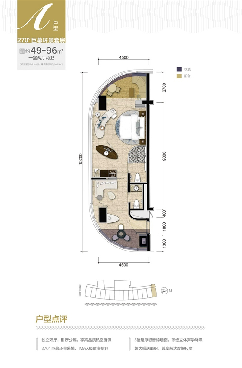 【A户型 270°巨幕环景套房】建筑面积 约49-96㎡ 一室两厅两卫独立双厅,卧厅分隔,享高品质私密度假;270°巨幕环景幕墙,IMAX级瞰海视野;5倍超厚吸音棉墙面,顶级立体声学降噪;超大赠送面积,尊享豁达度假尺度。